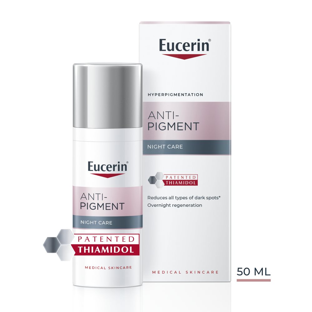 Az Eucerin Anti-Pigment Éjszakai arckrém egy hatékony, szabadalmaztatott hatóanyagot, thiamidolt tartalmaz, mely a hiperpigmentáció kiváltó okára hatva csökkenti a melanintermelést. Klinikailag és bőrgyógyászatilag bizonyított, hogy csökkenti a sötét foltokat és megelőzi újbóli kialakulásukat. Az első eredmények már két hét után láthatók, és rendszeres használat mellett a javulás folyamatos.