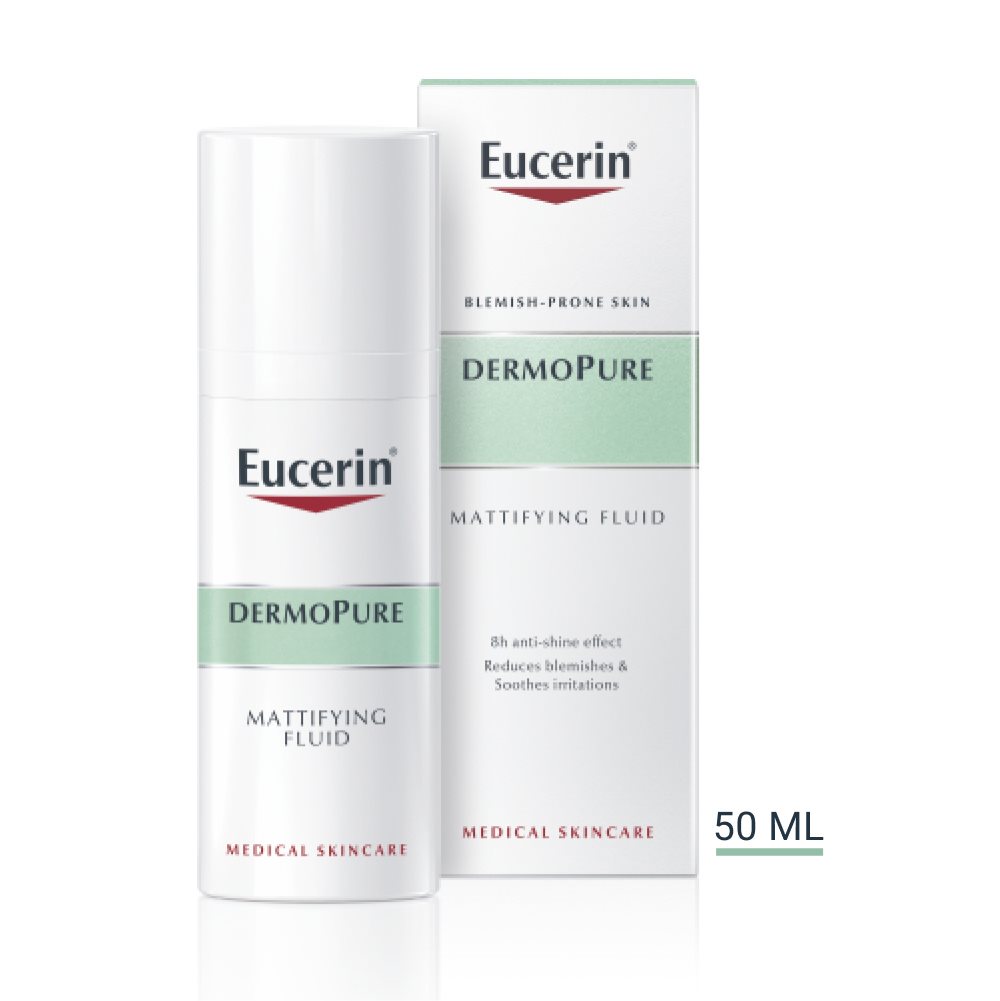 Az Eucerin DermoPure Bőrnyugtató krémet kifejezetten a gyógyszeres aknekezelés következtében szárazzá és irritálttá vált bőr igényeihez igazodva fejlesztették ki. Az Eucerin DermoPure Mattító fluid a pattanások és a túlzott faggyútermelődés ellen hat.