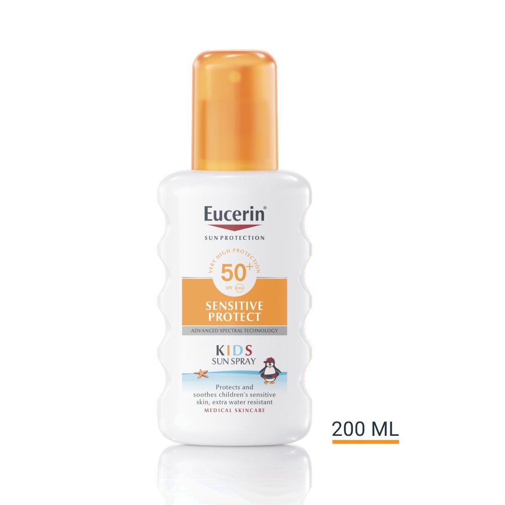 Az Eucerin Sun Sensitive Protect Gyermek napozó spray SPF50+ gyermekek számára készült naptej, melyet kifejezetten arra fejlesztettek ki, hogy nyugtassa az érzékeny bőrt és védjen a napégés, valamint a maradandó bőrkárosodás ellen. Atópiás bőrre is használható. A Szélesspektrumú Új Generációs Technológia egyesíti a nagyon magas fokú UV-védelmet biztosító szélessávú és fotostabil UVA/UVB-szűrőket1 és a licochalcone A hatóanyagot – így semlegesíti az UV-fény és a HEVIS következtében létrejött szabadgyököket.