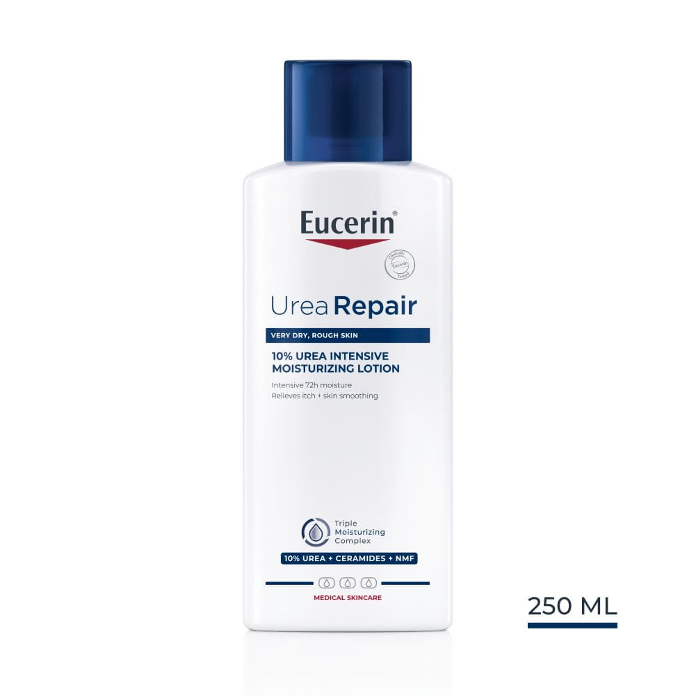 Az Eucerin UreaRepair PLUS 10% urea testápoló nagy koncentrációban tartalmaz ureát és más természetes hidratáló faktorokat (melyek megkötik a vizet a bőrben), valamint ceramidot (a bőr védelmi funkciójának helyreállítására és a nedvességvesztés csökkentésére). A formula azonnali enyhülést nyújt, és hatását folyamatosan kifejtve akár 48 órán át késlelteti a rendkívül száraz bőr tüneteinek (például a viszketésnek és a pikkelyesedésnek) a megjelenését.